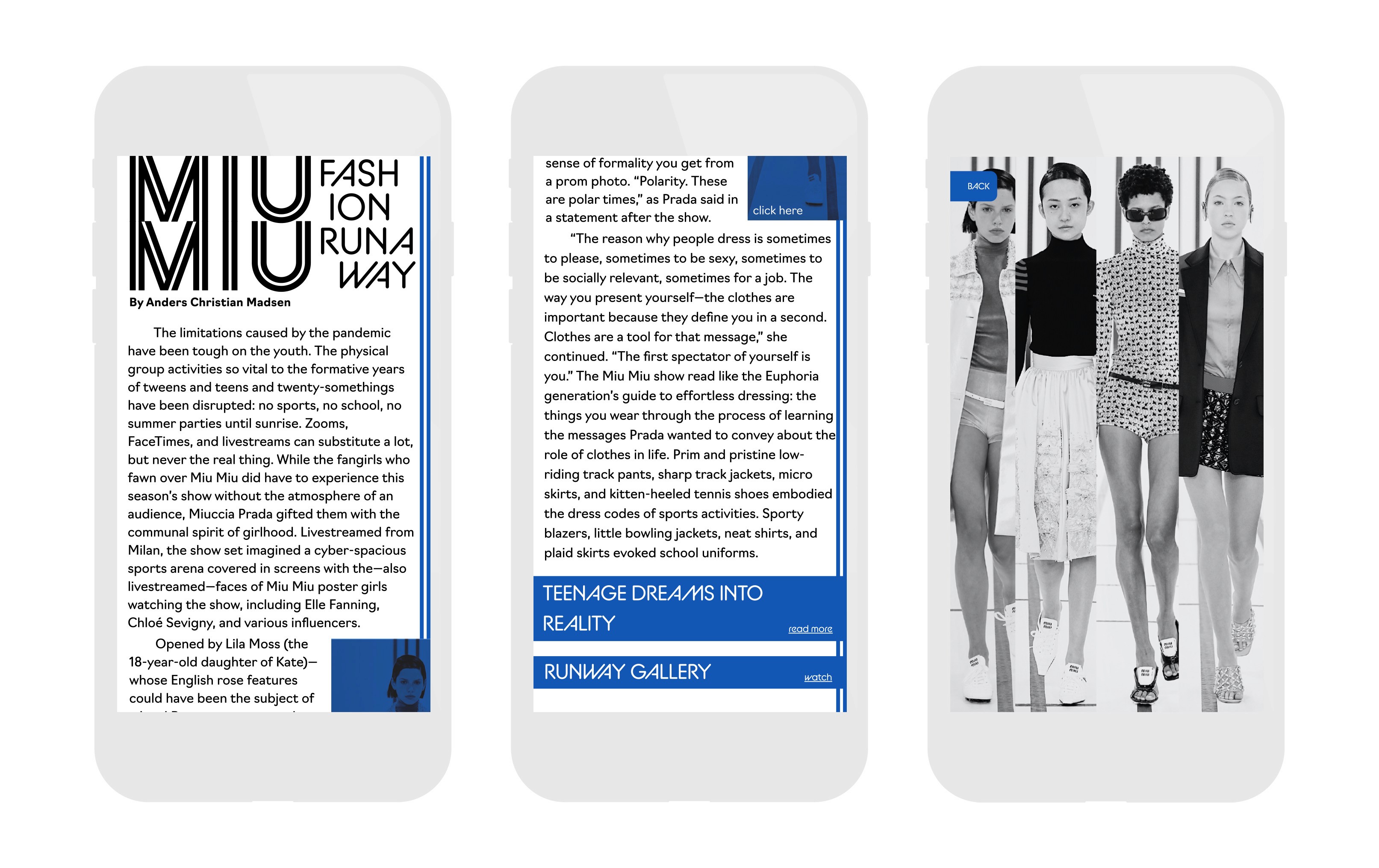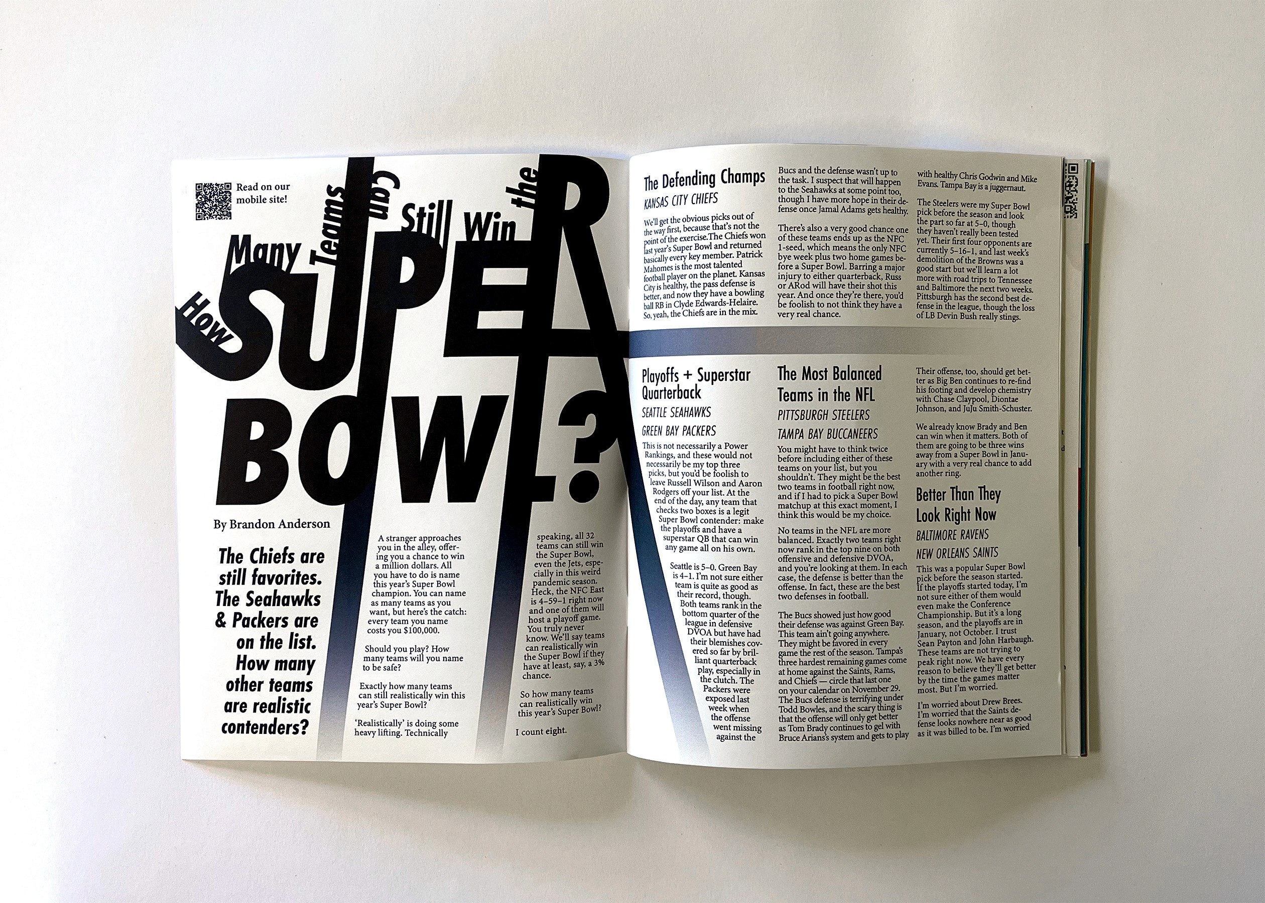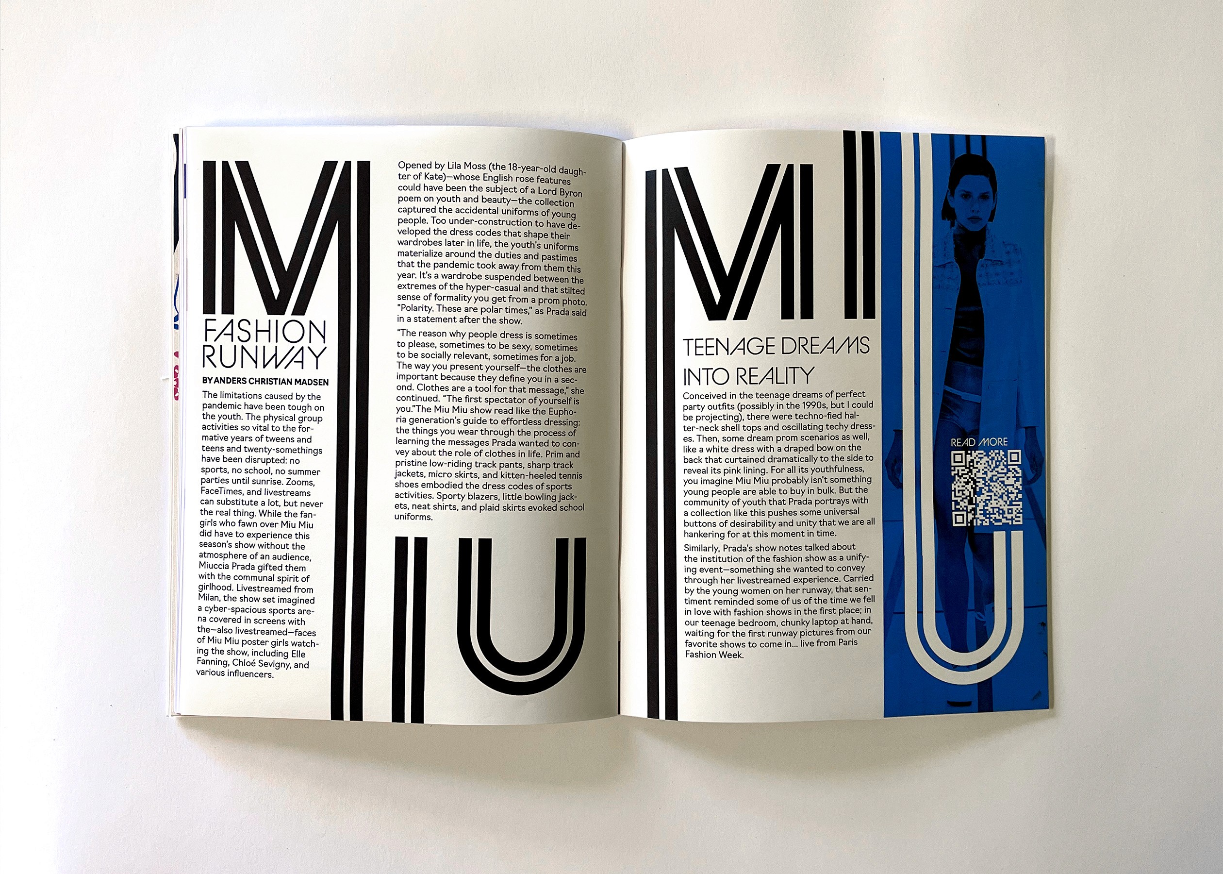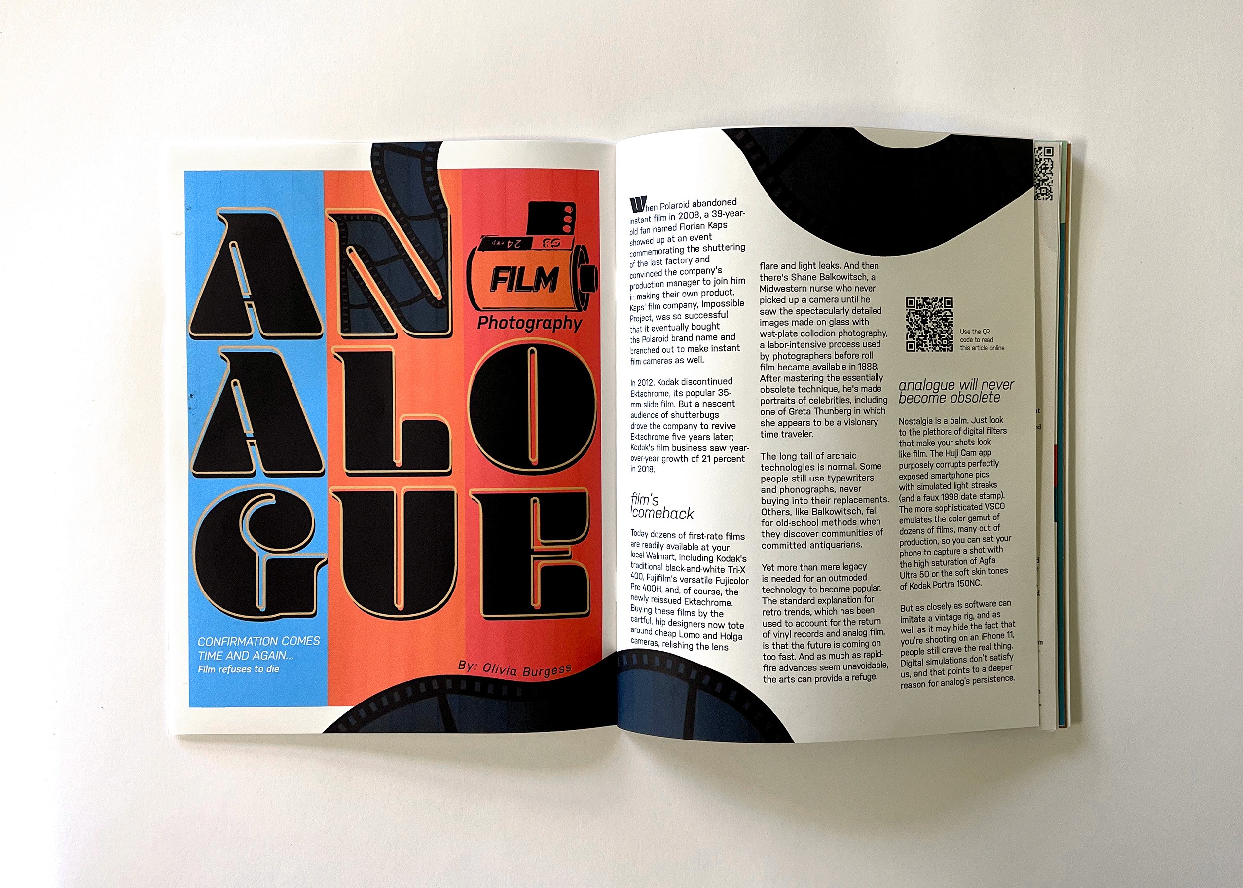 Prompt: students choose an article of their interest and redesign its layout as a magazine spread, creating a typographic artwork for the title. In addition to the spread, students learn to adapt their print designs to an online format by prototyping mobile web pages of the article in Adobe XD. The webpage and the spread must be consistent to represent the same article. The design relies on typography, hierarchy, and layout, with intentional typographic elements to convey clear clues about the articles' structure and enhance the overall reading experience on both platforms.