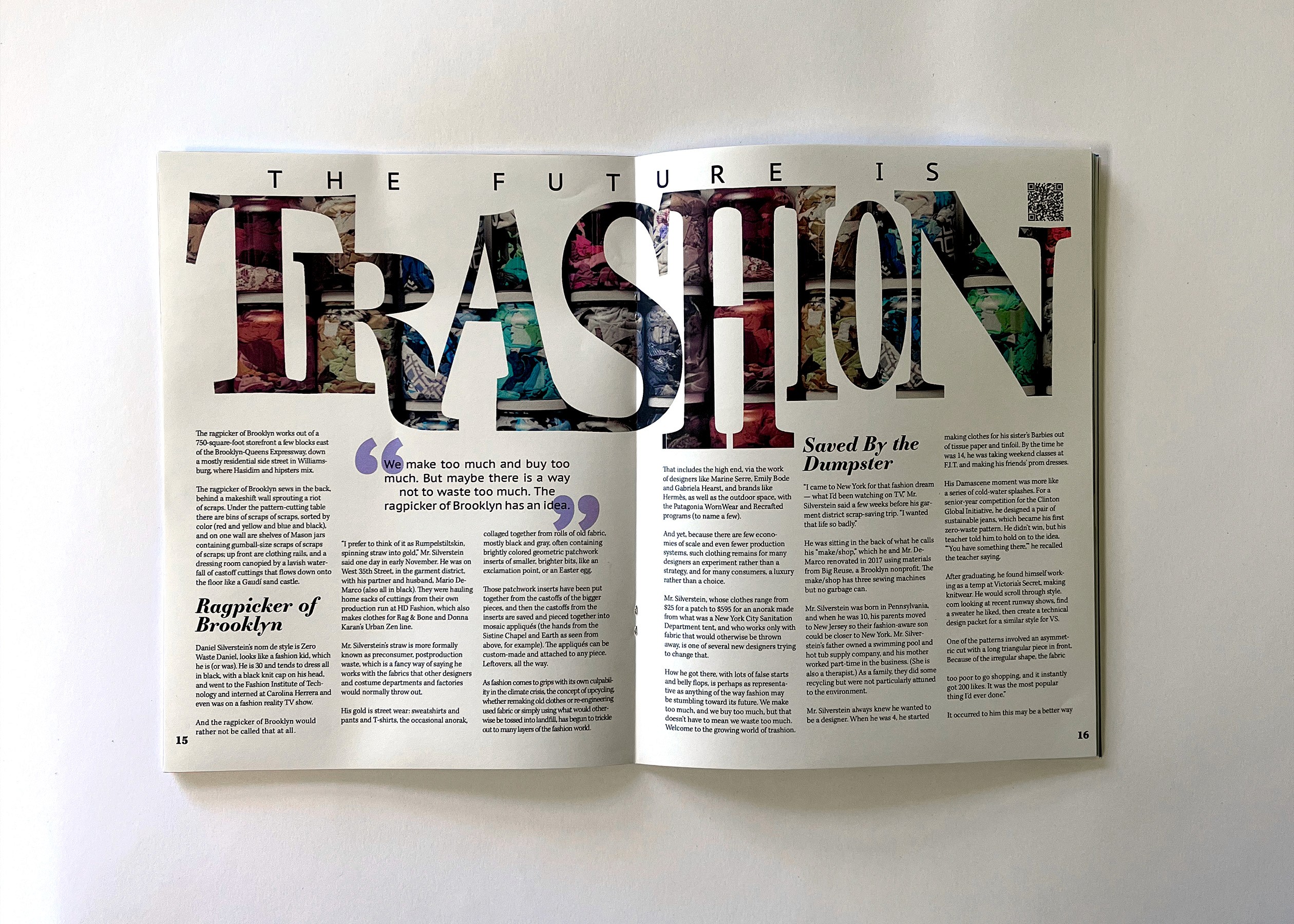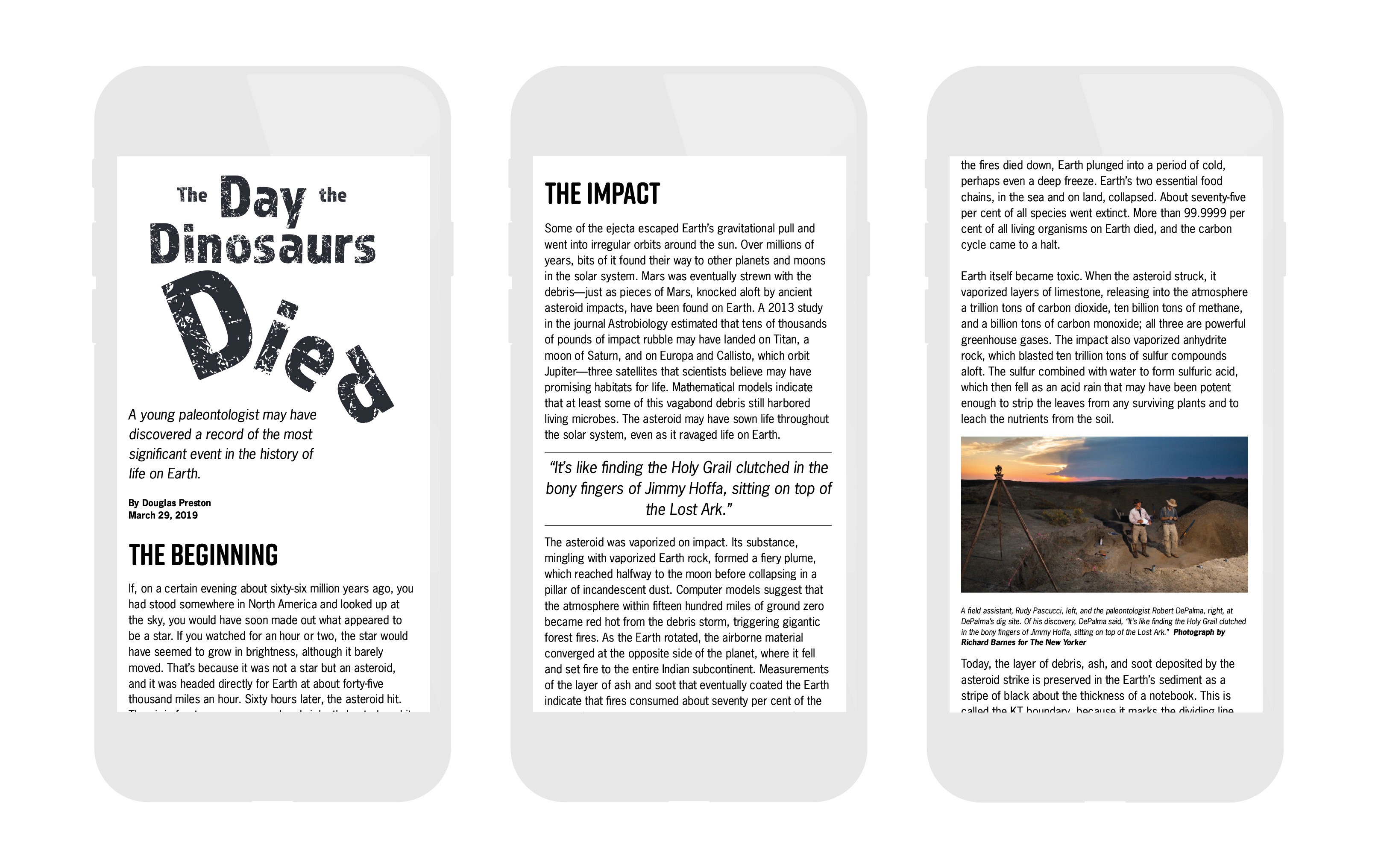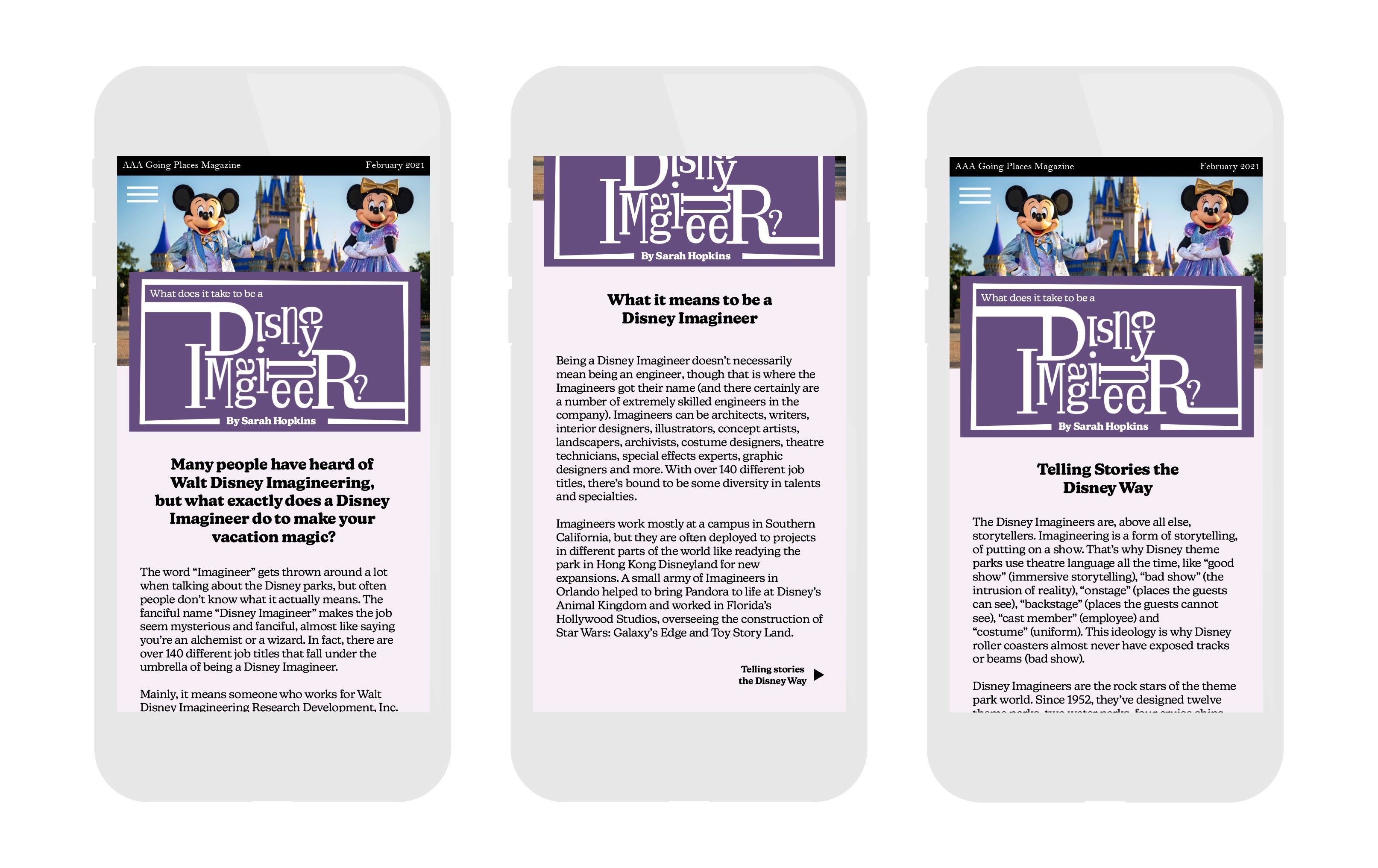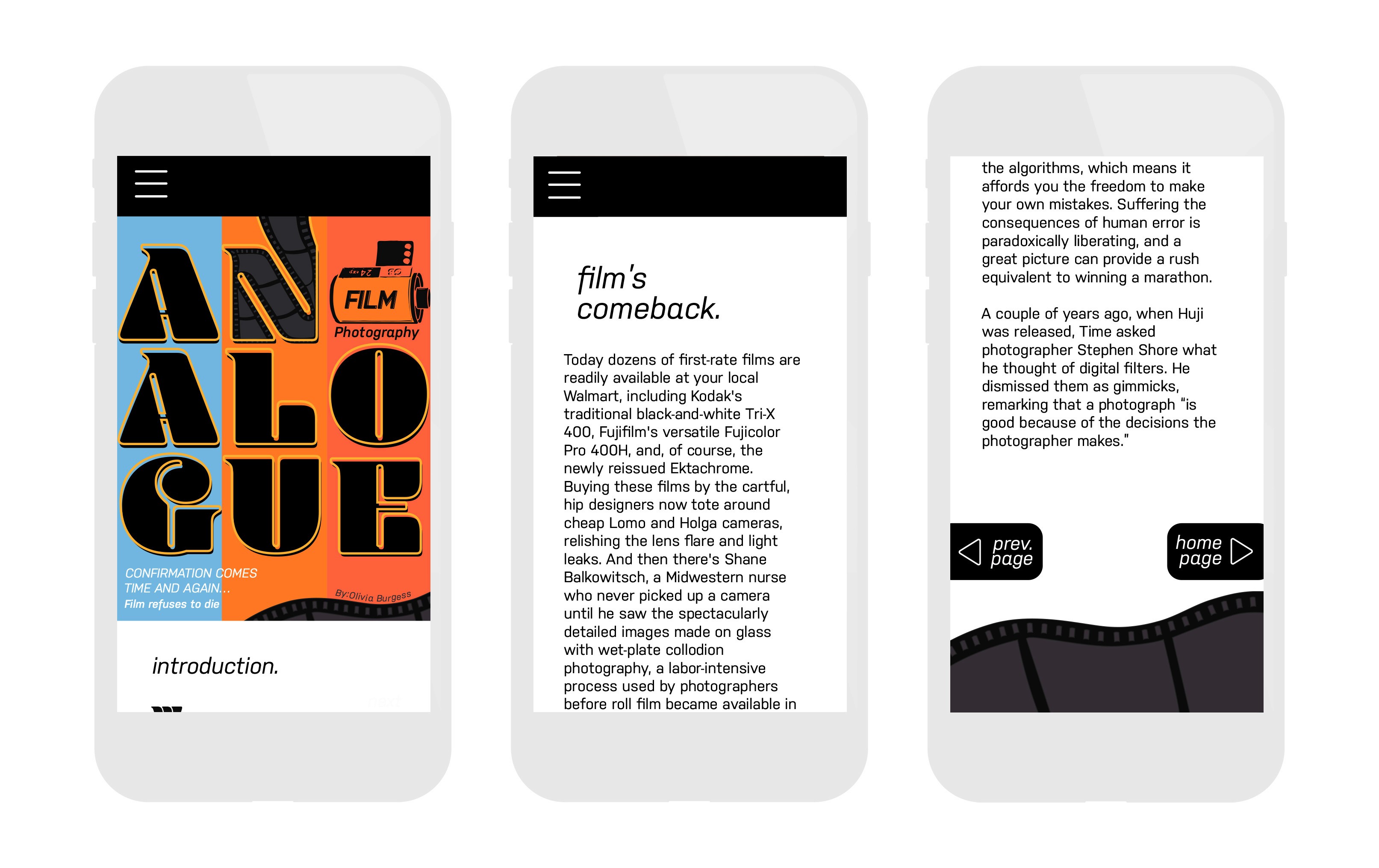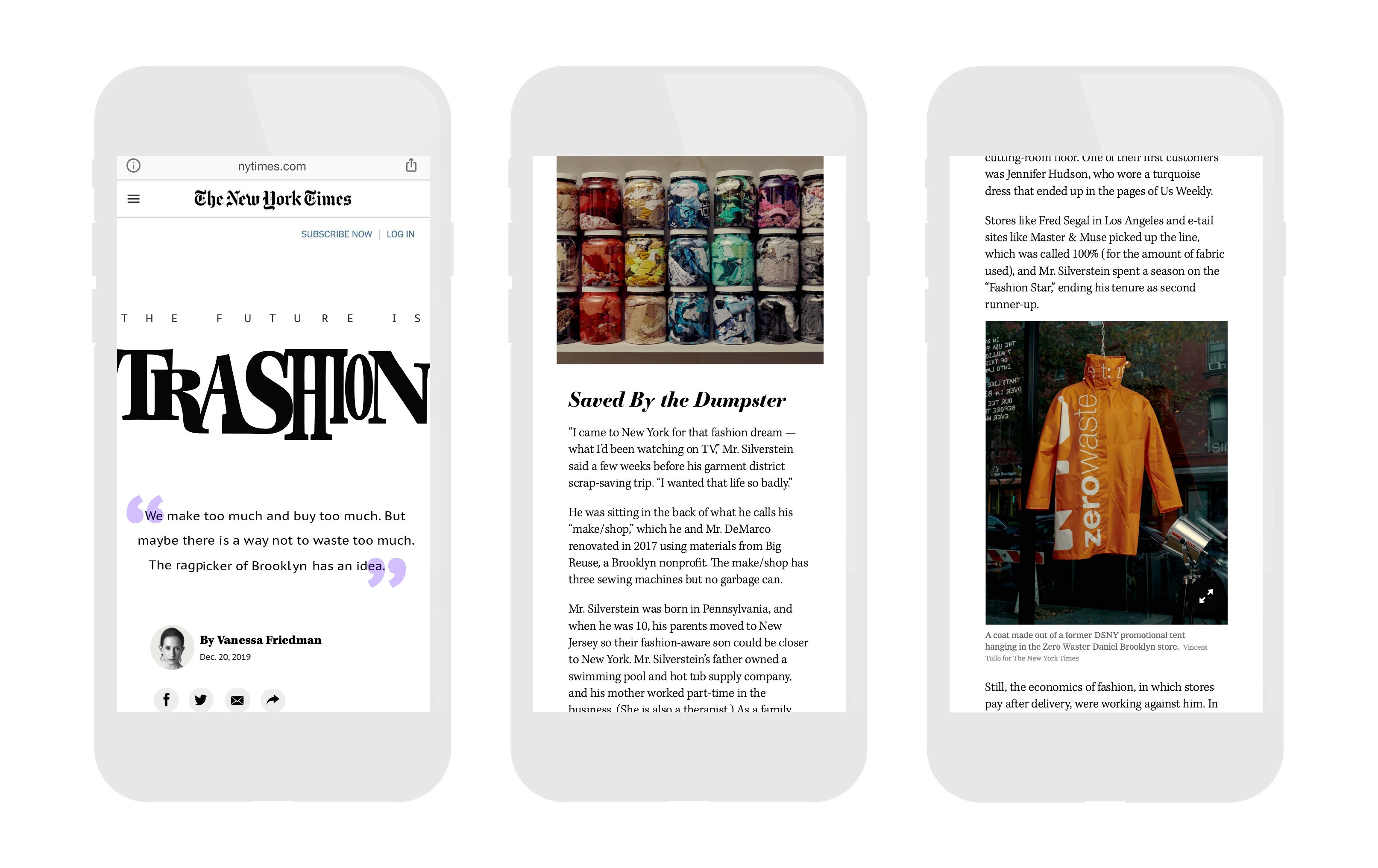 Prompt: students choose an article of their interest and redesign its layout as a magazine spread, creating a typographic artwork for the title. In addition to the spread, students learn to adapt their print designs to an online format by prototyping mobile web pages of the article in Adobe XD. The webpage and the spread must be consistent to represent the same article. The design relies on typography, hierarchy, and layout, with intentional typographic elements to convey clear clues about the articles' structure and enhance the overall reading experience on both platforms.