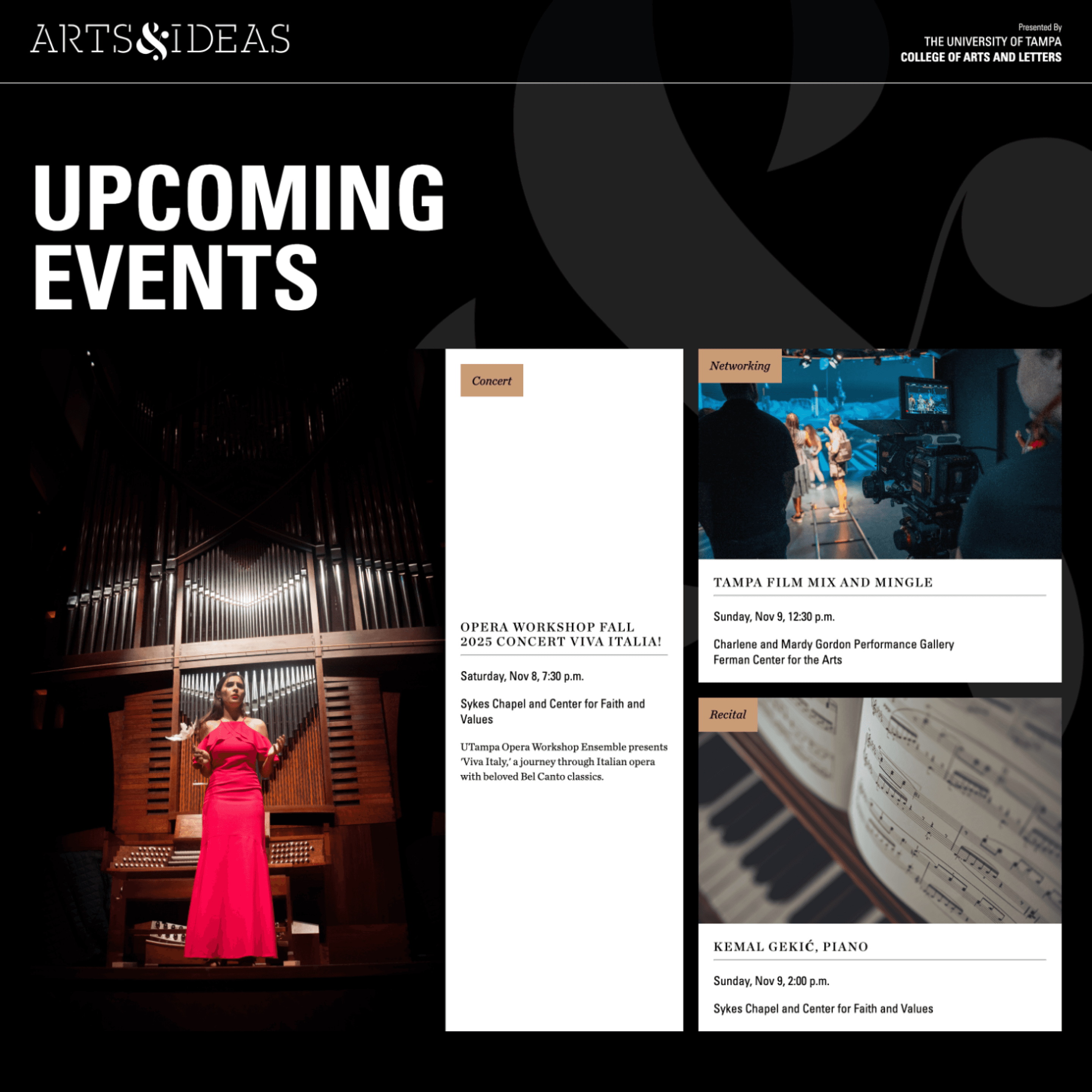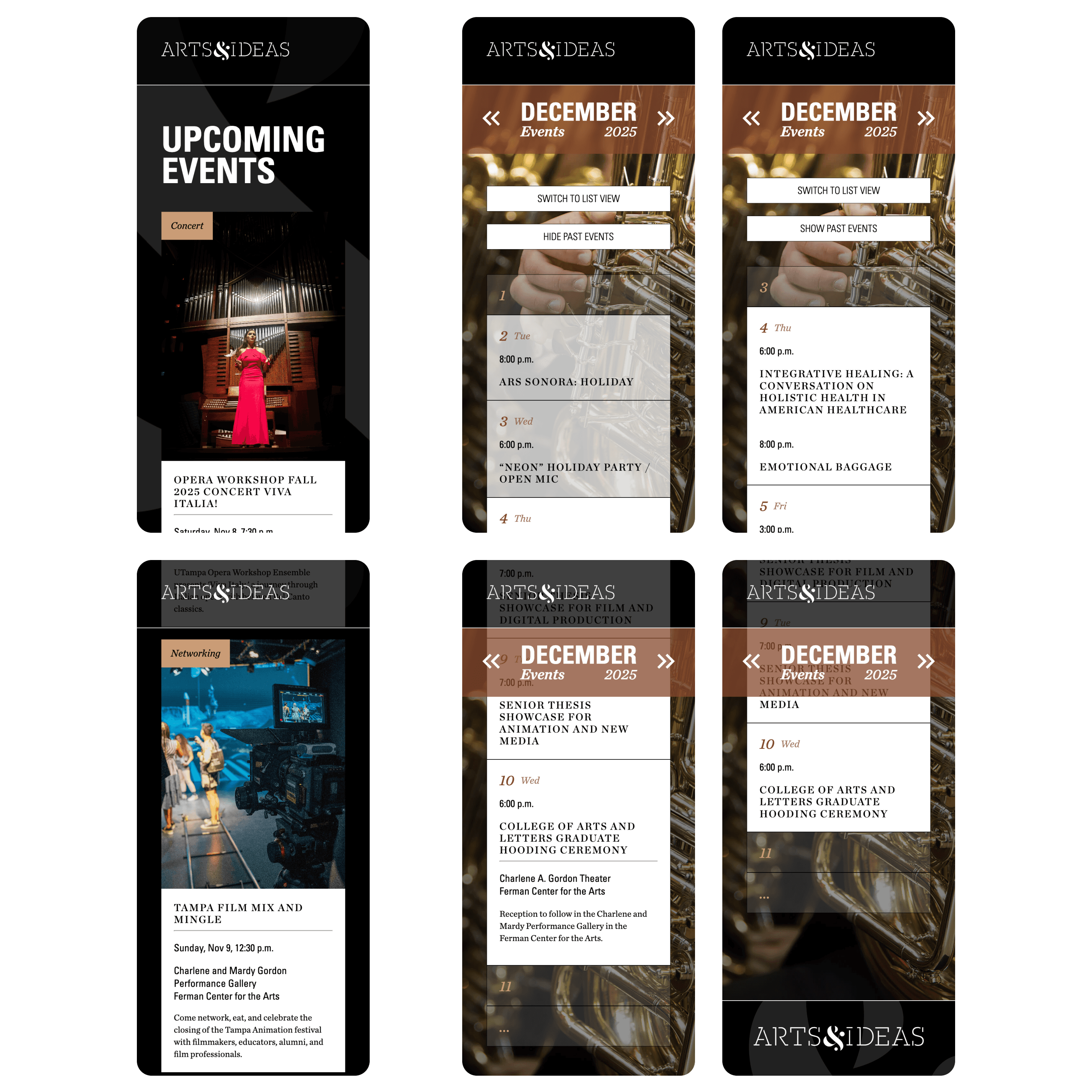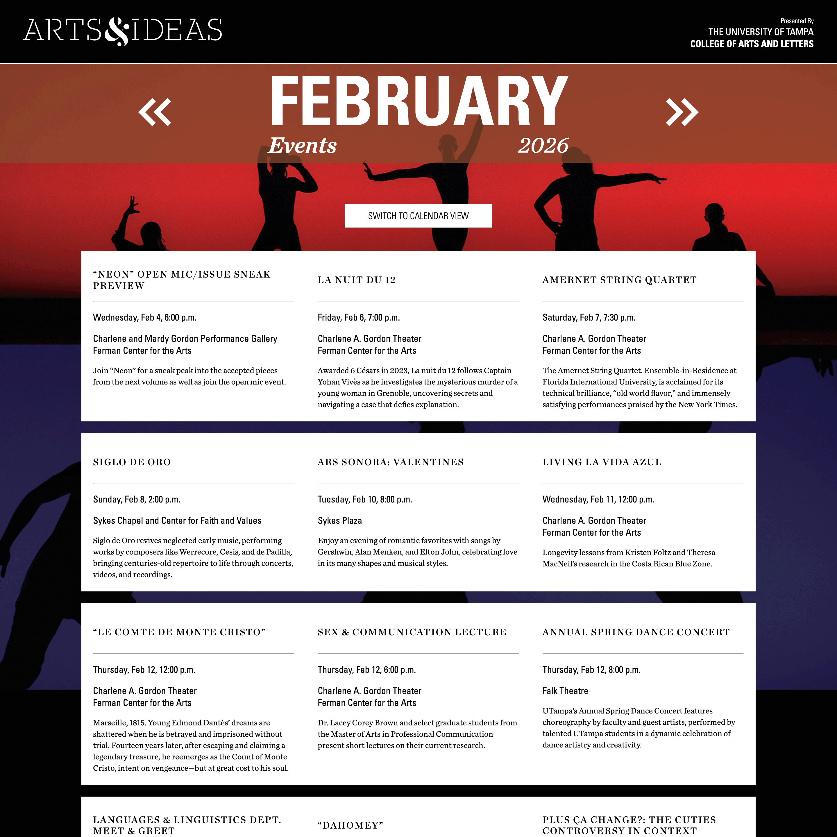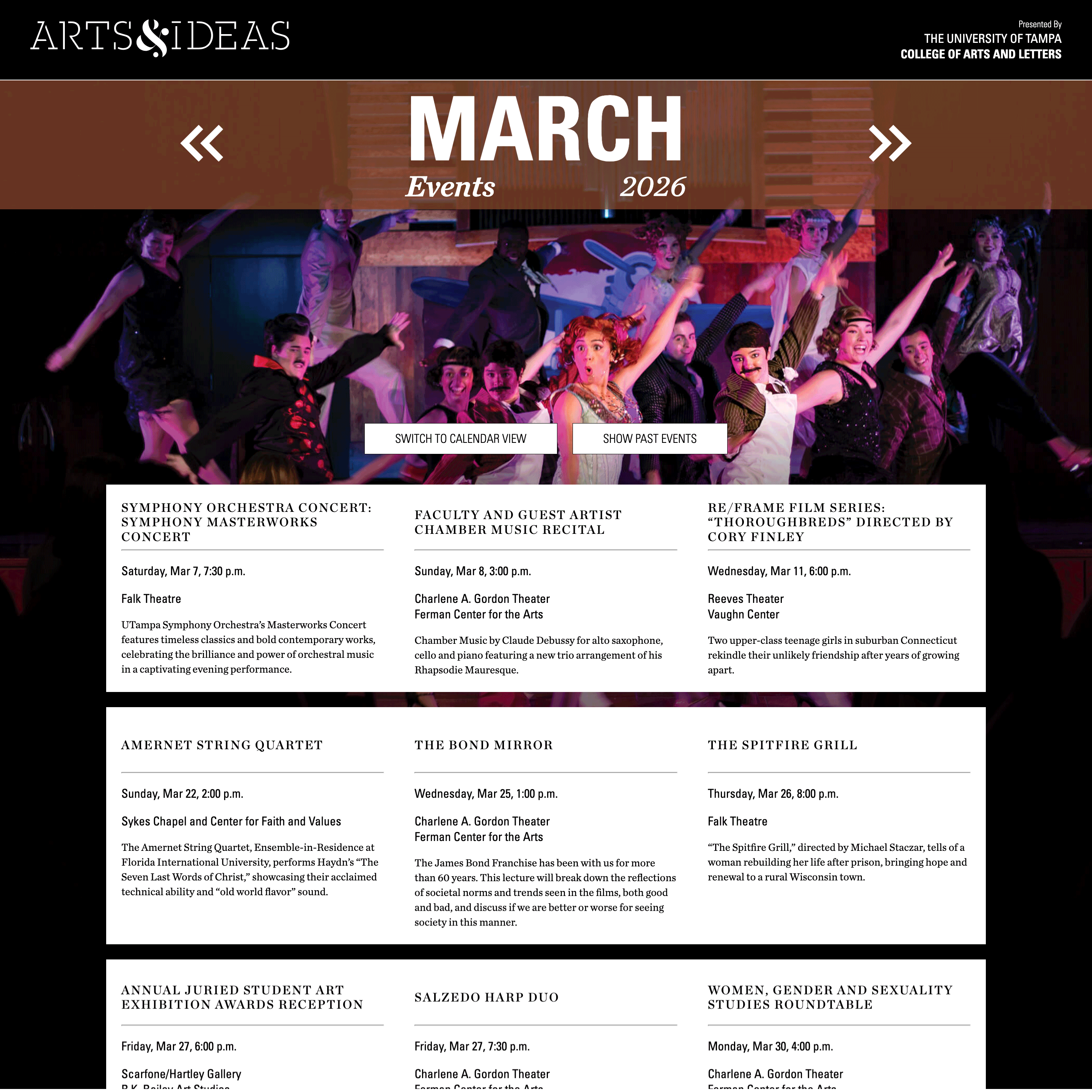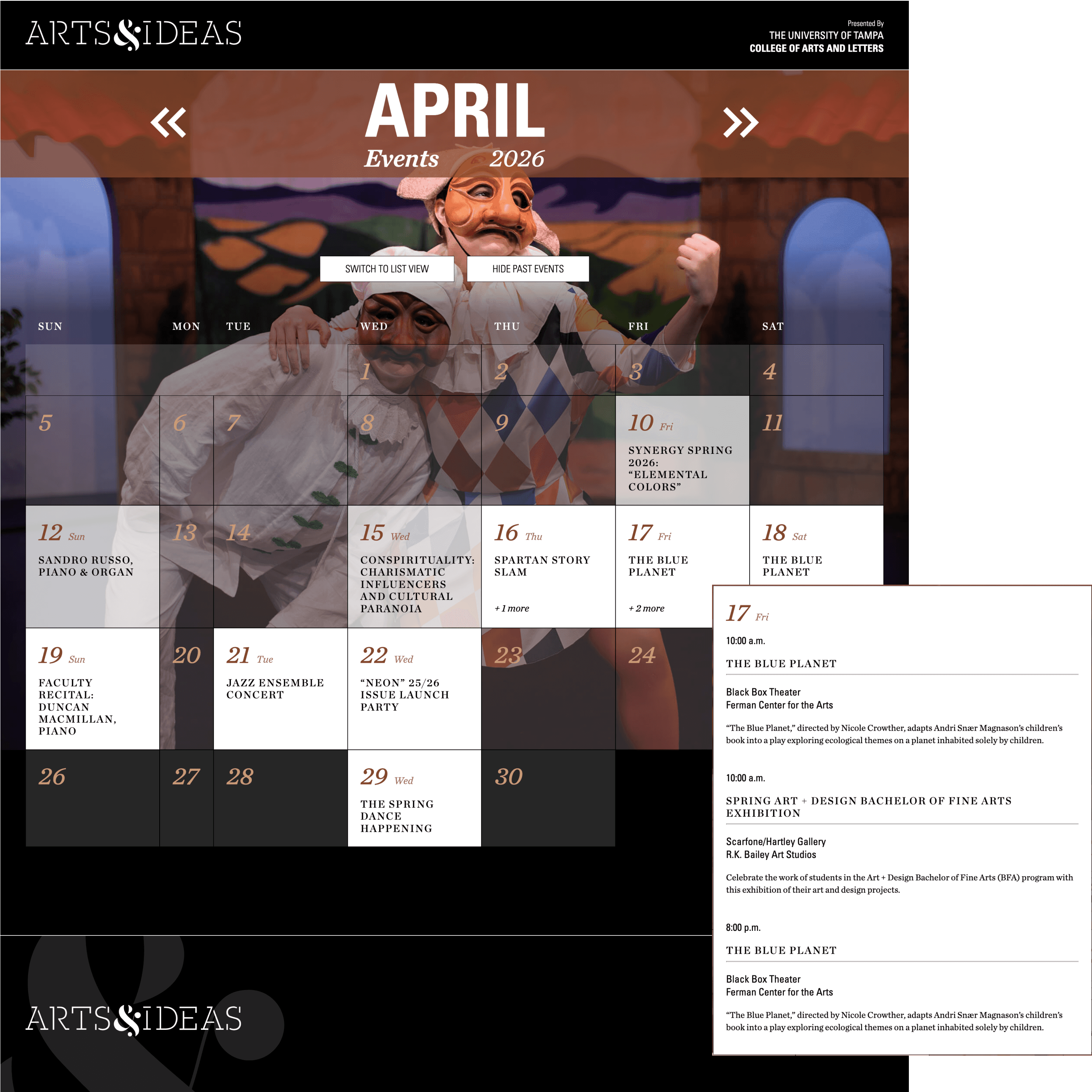 Arts & Ideas, the University of Tampa College of Arts & Letters' annual print publication, needed a digital presence to make event information more accessible throughout the academic year. Working with the publication's designer, I built a responsive web platform that preserves the publication's visual identity while adding interactive features like auto-updating upcoming events, dual calendar views (list and grid), and mobile-optimized layouts.